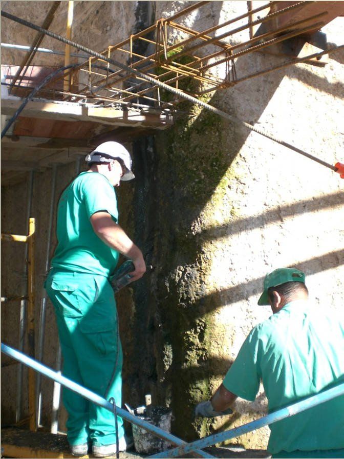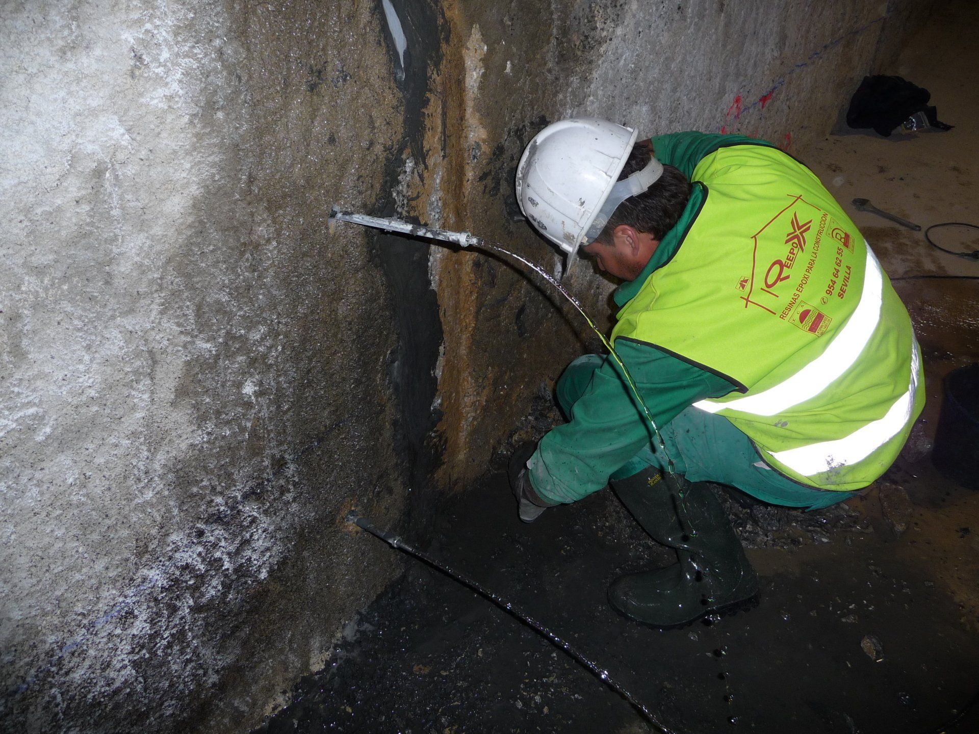 Acsa. C/Mendigorria, Sevilla. Tratamiento de filtraciones por juntas de pantalla, unión losa muro...